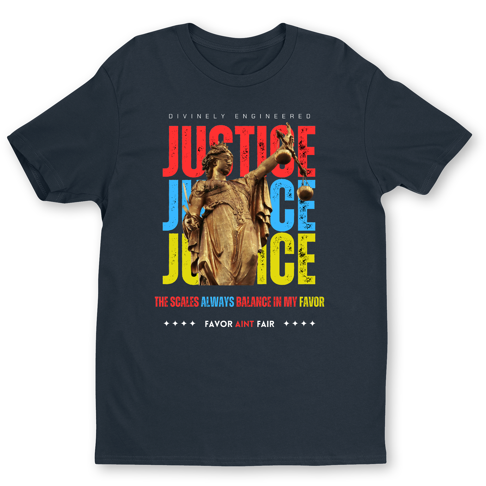When your favor simply ain't FAIR. Our "The Scales Always Balance In My Favor" T-shirt is a high-impact piece for those who move with confidence and divine certainty. Featuring a gold-toned Lady Justice statue set against a striking red, blue, and yellow typographic background, this design is a masterpiece of modern spiritual streetwear.